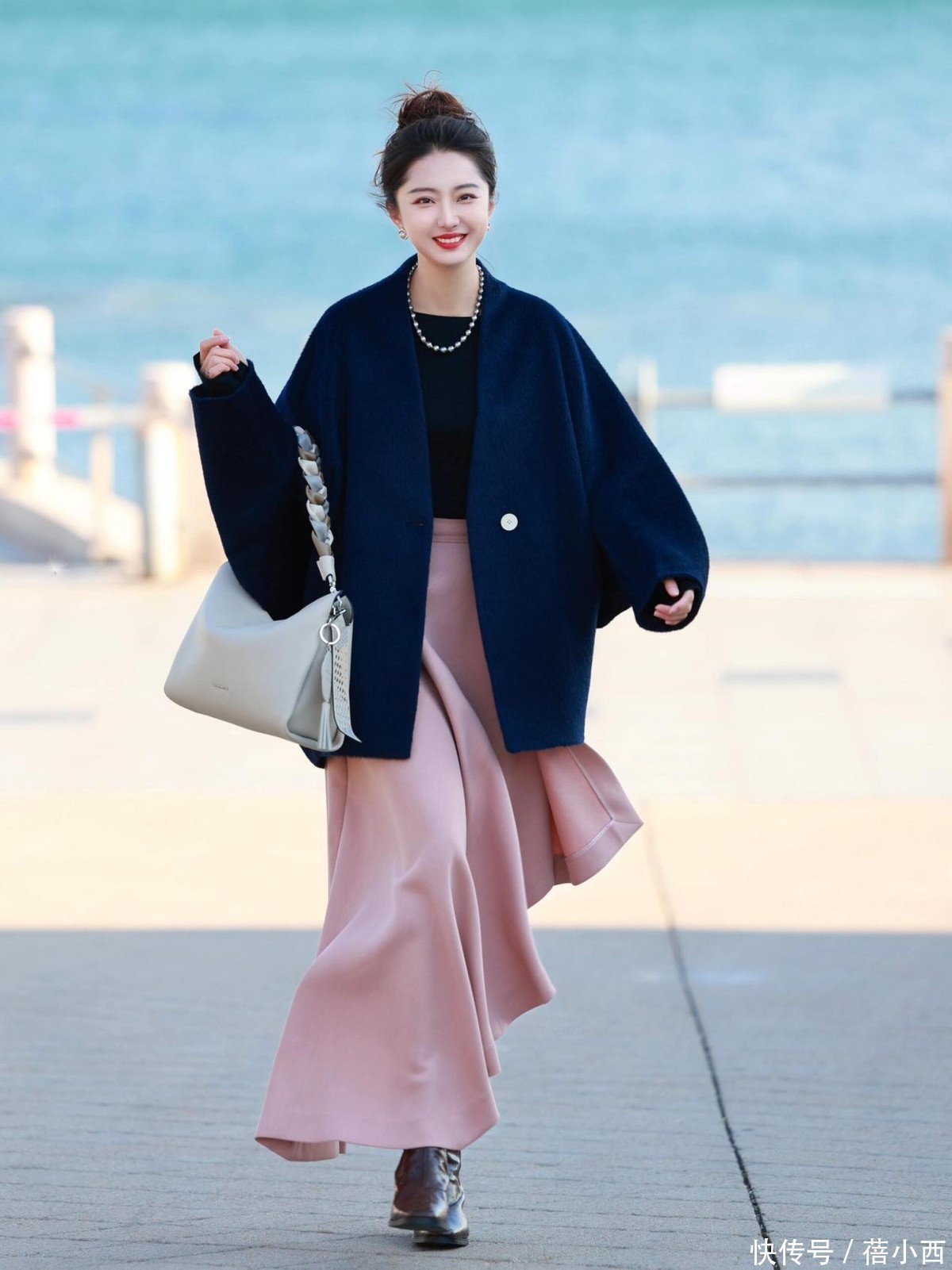 这套穿搭走的是优雅撞色风,将藏蓝的沉稳与豆沙粉的柔媚融合得恰到好处,藏蓝色廓形毛呢外套采用无领设计,利落的线条弱化了厚重感,单颗金属扣的点缀又添了几分精致,宽松的版型对身形包容度极高,行走间自带洒脱气场,下装搭配豆沙粉色缎面长裙,柔滑的面料与垂坠的裙摆形成流动的美感,温柔还轻盈。