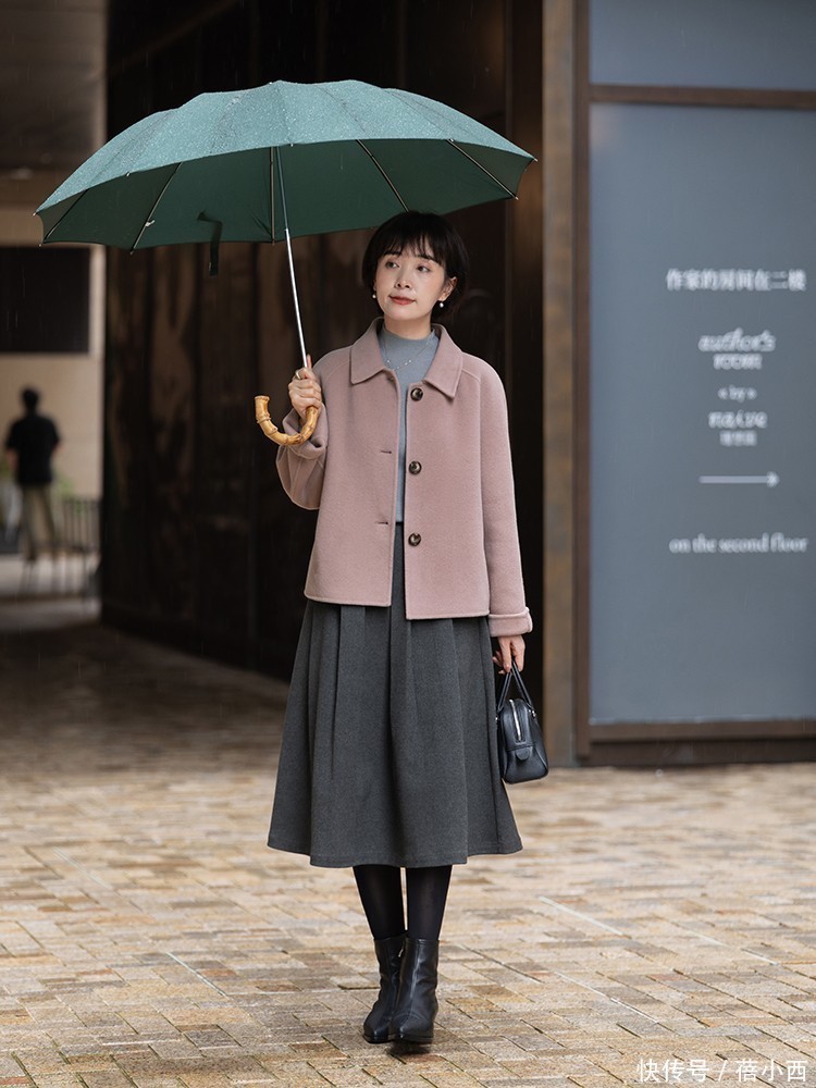 成熟女性可以尝试豆沙粉毛呢外套,外套颜色低调,衬得肤色温润,再借助利落的短款版型拉高腰线,还能弱化秋冬穿搭的厚重感。内搭浅灰色修身针织衫,与下装深灰色A字毛呢半裙形成深浅层次,简单却很有细节。