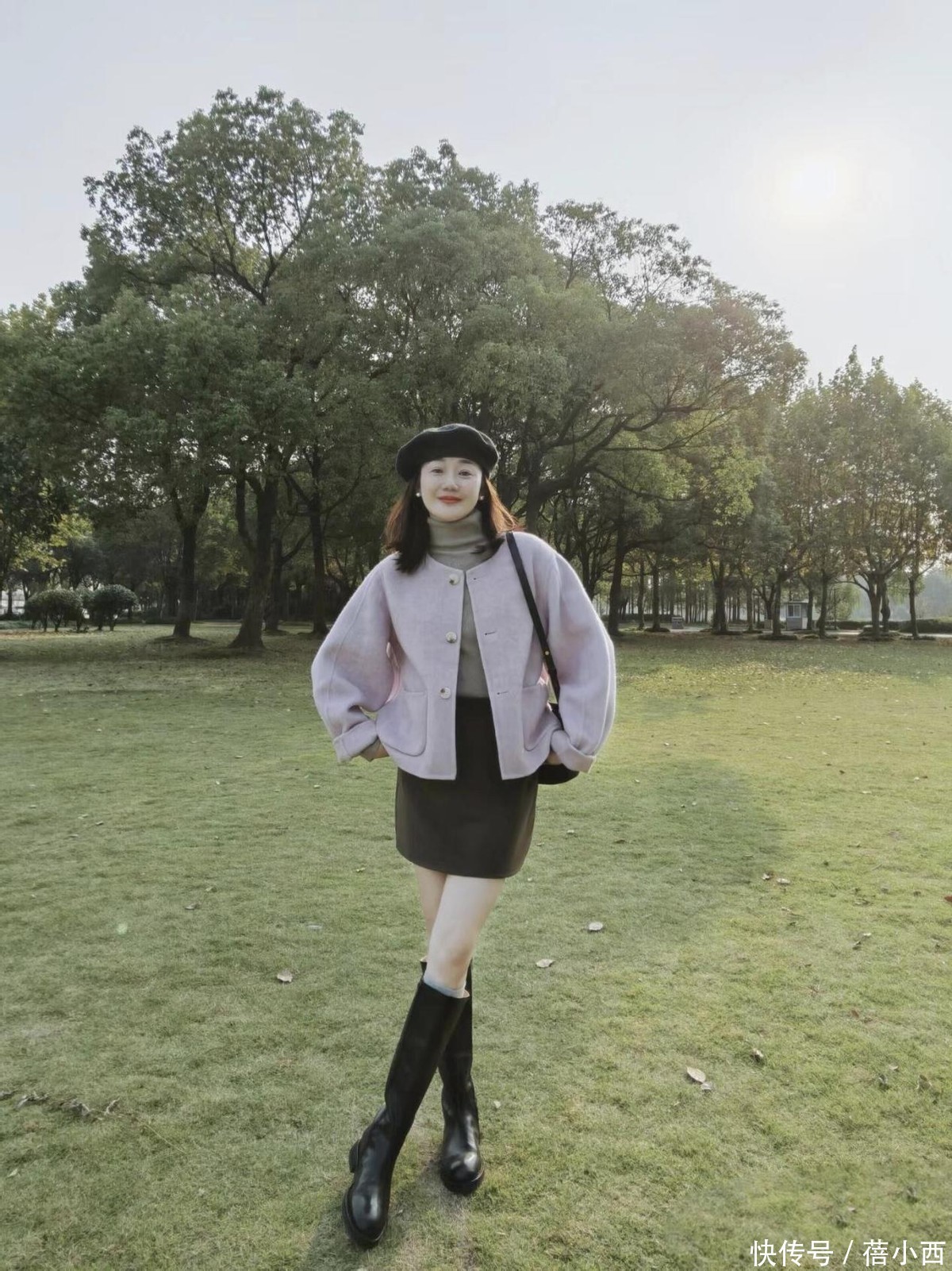小个子可以来尝试这一套搭配,浅芋粉色短款毛呢外套超级温柔,小香风的圆领设计加上泡泡袖,少女感直接拉满,短款版型还特别显腿长。内搭浅灰色高领针织衫,简单又百搭,刚好中和了外套的甜腻。